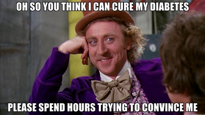 Third: ALL diabetics can control it through diet and exorcise. Additionally, insulin is only taken when the patient's disease is extremely out of control. (Some people don't add the last part, but that is pretty much what it means.) I suppose this can be true to an extent. I know for a fact that if I exorcise when I am high, then my sugar will come down. Of course, eating any kind of carbs will bring it up. But it doesn't always work that way. Sometimes I might be stressed out, and if that is the case, no amount of exorcise I can do will bring my sugar down. Insulin helps at that point, but it is not because my disease is extremely out of control. You have to consider the difference between a Type 1 Diabetic and a Type 2 Diabetic at this point. Recall that a Type 1's pancreas has been destroyed and therefore the person is insulin dependent. It doesn't matter how much exorcise a Type 1 does, the body will not produce insulin because it is not capable of doing this.